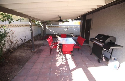 This amazing house boasts three spacious bedrooms, each with its own private bathroom, ensuring maximum comfort and privacy for all guests. The large open living room is furnished with a cozy sectional sofa that overlooks the fabulous 60s throwback shaped pool, perfect for beating the Vegas heat. And when you're ready to soak up some sun, head outside to the inviting covered patio, complete with a table perfect for poolside dining.