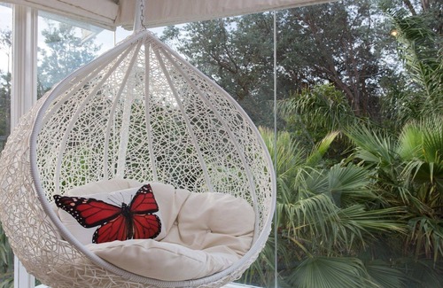 Walk up the stunning staircase and you will reach the kitchen/dining area. The beautifully designed kitchen features a wall oven, electric stovetop, dishwasher, microwave and even a coffee machine. The kitchen includes a large stainless steel fridge, with an ice making machine. In the dining area there is a wooden table that will seat 8 guests. Next to this area is another spacious lounge room with a flat screen tv and overlooks an entertaining area and lush green gardens.