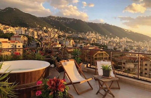 It's an open modern space with a huge terrace with breathtaking views over the sea and the mountains. The terrace includes a big round jacuzzi from which you can enjoy an amazing sunset. Conveniently located between Beirut and Byblos, you have an easy access to the main tourist attractions, avoiding the hassle of Beirut. You will enjoy a Pool Billiard, Wifi, smart tv, air conditioning ...an experience you will not forget