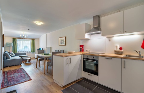 "Paulsberg", 2-room apartment 42 m2, on the upper floor. Object suitable for 4 adults. Renovated in 2025, modern and tasteful furnishings: living/dining room with 1 double sofabed (140 cm, length 200 cm), dining table. 1 double bedroom. Open kitchen (oven, 4 ceramic glass hob hotplates, electric coffee machine). Shower/WC. Parquet floors. Very beautiful panoramic view of the mountains and the countryside. Facilities: hair dryer. Internet (WiFi, free). Please note: suitable for families. Non-smoking house. Smoke alarm, fire extinguisher.