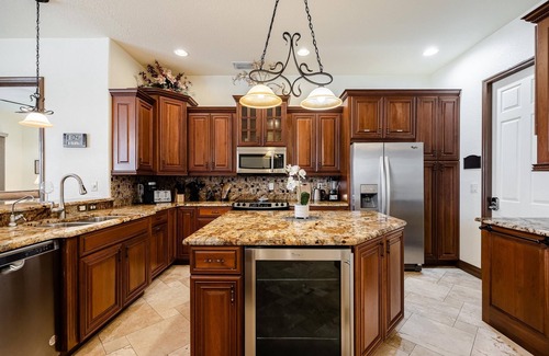 This home offers a beautiful kitchen which a dining table just adjacent which has seating for 8 guests. There are also 4 barstools at the counter. The kitchen is very large proving lots of counter space to make delicious melas for you and your guests. With stainless steel appliances, a wine fridge, coffee maker and well stocked kitchen - you will have everything you need for cooking while on vacation.