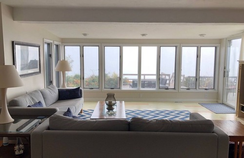The main floor is wide open, allowing views from all rooms. We have an updated kitchen and large living room with sweeping views of Cape Cod Bay. The living room opens onto a large deck.