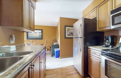 This inviting, ski-in/ski-out condo is perfect for families and groups of friends. You will find plenty of space and privacy in a gorgeous wooded setting. Find a well-equipped kitchen with all the essentials to whip up everything from full-course meals to quick snacks on the go. The living room is cozy and offers a great spot to unwind with your loved ones after a fun-filled day. Snuggle up in front of the wood-burning fireplace and watch a favorite show or movie on the TV, or take a refreshing midday nap on the comfy sofa. The balcony with a two-person bistro table offers nice views down the slopes and pond.