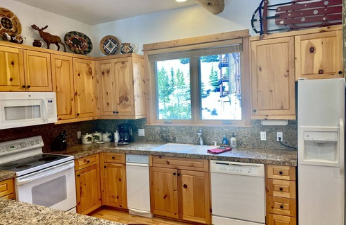 Slope facing Rare LoneMooseMeadow Ski In/Out Cozy, well equipped 2 bedroom, 2 bath condo with wood burning fireplace, glorious covered deck to soak in the sounds of the stream below and easy access to Mountain Village or Town Center. Beautiful backyard to let the kids sled or make snowmen in the afternoons.