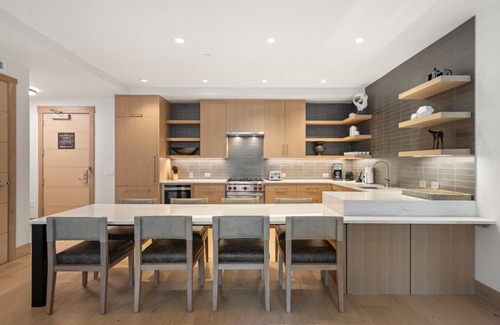 Fully equipped kitchen with upscale Bosch appliances such as oven, microwave, dishwasher, cooktop. Fisher & Paykel refrigerator and a Wolf range as well as wine fridge are available for our guests. Two-sided dine-at peninsula with quartz countertop. Wet bar with undercounter refrigerator, microwave, sink, housewares and a Nespresso coffee machine. You'll find everything you need to create a delicious meal, from measuring cups to a wine decanter and everything in between.