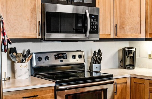With mountain décor and plenty of room for everyone to spread out, no one will have trouble kicking back on the plush sofas as a movie plays on the flat screen TV. When everyone works up an appetite, the chef of the group will love hopping into the full kitchen to whip up warm meals on modern appliances. When the sun begins to go down, slip into your bathing suit and soak in the hot tub until the stars come out.