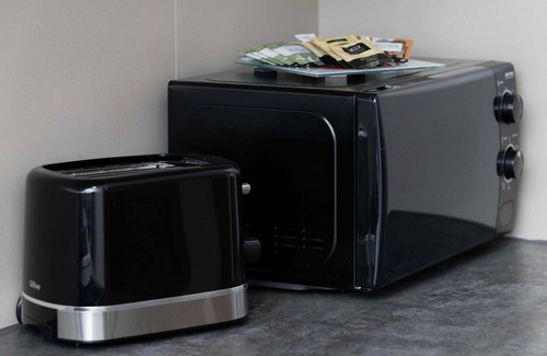 Electric hob, fridge with freezer, microwave, gas kettle, capsule coffee maker, blender, steamer, sandwich toaster, set of dishes and kitchen utensils