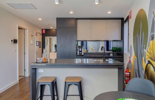 The apartment has been built with excellent insulation and soundproofing ensuring a quiet escape in a central location. A moody queen-sized bedroom ensures a comfortable night's sleep with high-quality linens, furnishings, blinds and a ceiling fan. It includes a spacious built-in mirrored wardrobe for storing your belongings. The bathroom is well-appointed allowing guests to refresh in style and comes with an oversized shower and complimentary toiletries for your stay.