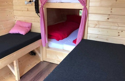 Cuddly, made of solid wood Schlaffass with 2 single beds and a double bunk bed. The sleeping space is uncomplicated and quickly converted into a living room. With electricity. Sanitary facilities are centrally located on the square usable. Linen (linen / pillow / cover) not included in the price. Can be booked on site, subject to availability. Bread rolls and breakfast basket can be ordered on site.