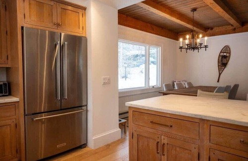 The stunning chef's kitchen features a breakfast bar with seating for three, large window with views of the mountain, a large farmhouse sink, and a glass-top range oven. The kitchen is fully stocked with cooking essentials. Enjoy your ski trip meals in the connected dining room with seating for eight guests while soaking in the views.