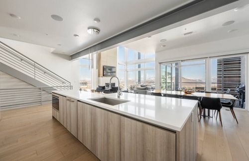 The heart of the living space is two story open floor plan living area with fireplace and floor-to-ceiling windows with spectacular mountain views. Chef's kitchen features luxury appliances and is fully equipped for to enable a great evening with family and friends. Living room features a soaring fireplace with comfortable seating and large screen TV. Dining area has an ideal with view of the fireplace as well as the setting sun.
