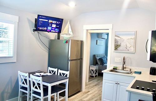 The kitchen is equipped with a stovetop and a refrigerator, as well as a coffee maker, a microwave, and cookware. Connect to the WiFi, or get cozy in front of the Smart TV. Bathroom amenities include towels, toilet paper, and soap. Other amenities at this 1-bedroom, 1-bathroom rental include bed sheets, an ironing board, air conditioning, and heating.