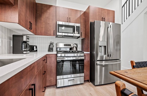 The modern kitchen is a cook’s dream, with quartz countertops, a gas stove, stainless steel appliances—including a large refrigerator with ice maker—and all the essentials for preparing meals. The dining table seats six, with two additional ottomans available for larger gatherings.