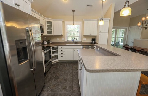 3 bedrooms (1 with King and TV and full bath with tub and shower; 1 with 2 Doubles and TV; 1 with 2 Bunk sets and TV/DVD player); full hall bath with tub and shower; laundry; screened porch with hot tub.