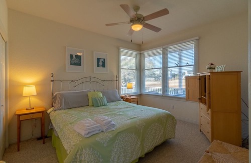 Top Level: Living area with an open concept great room, dining, and kitchen area with access to a large side deck with a nice view of the 13th Fairway, half bath, king en suite with a TV with Roku streaming options and a bathroom with a large tub and a stall shower.