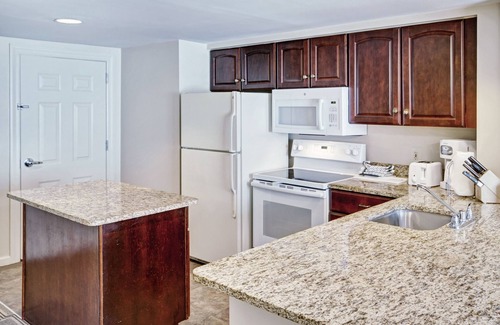 This spacious one bedroom condo can vary from 612 to 858 square feet. The suite provides luxurious amenities, aside from the private bedroom with a king bed. The separate living area includes a queen sleeper sofa, a small kitchen, and a dining area. The kitchen adds affordability and convenience, allowing for delicious meals to be made from the comfort of the suite. The maximum occupancy of this room is four people.
