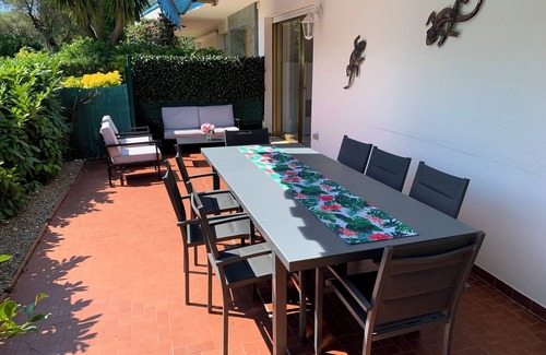 A splendid 3 bedroom, 3 bathroom, spacious ground floor apartment with fantastic large pool and terrace. Sleeps 8people in 3 seoerate bedrooms. Ideal for 2 families or larger families and only a 5 minutes walk to the sandy beaches of Juan Les Pins. You will be sure of a relaxed and comprehensive holiday in this apartment.