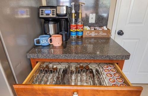 Enjoy cooking together in the fully equipped kitchen, complete with stainless steel appliances and all the cookware you need. Gather around the dining table for family-style meals or grab a quick bite at the bar top. A coffee and drink station adds a special touch, perfect for starting your mornings or winding down in the evenings.