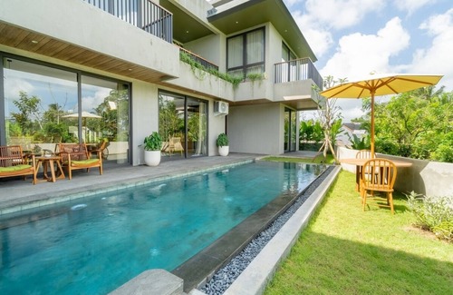 Welcome to a spacious 5-bedroom villa with breathtaking rice field views, thoughtfully designed for families and groups seeking the true serenity of Ubud’s countryside. Wake up to golden sunlight streaming across lush terraces, then spend the day relaxing by your private pool or enjoying time together in the expansive living and dining areas that open seamlessly to the outdoors.