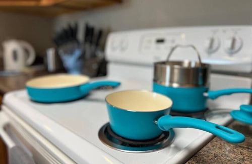 Cook your meals in our well stocked kitchen with all the basic necessities like microwave, full sized stove, oven, and refrigerator, pots & pans, rice cooker, slow cooker, bake ware, dining ware, food storage, mixing bowls, several spices, etc. And dine in style at the dining table, and bar. And for you winos, yeah, we have wine glasses too.