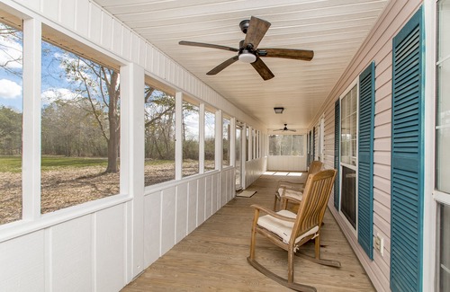 Step outside to the screened-in front porch for a morning meditation or relax on the open back porch as the sun sets. The property's grounds are a highlight, featuring a massive live oak tree under which guests can read, picnic, or simply soak in the tranquil surroundings. The seclusion of the location means every star is visible at night, and the only sounds you'll hear are those of nature.