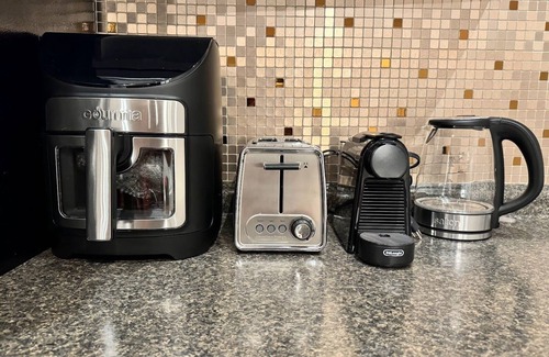 - Kitchenette has microwave, coffee maker, kettle, and toaster