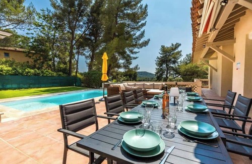 Nestled in a secure estate in the heart of the countryside, this beautifully renovated 1960s villa offers a tranquil escape with modern comforts and ample space. Ideal for families or groups, the villa features large terraces, a private heated pool, and flexible sleeping arrangements to accommodate up to 10 guests.