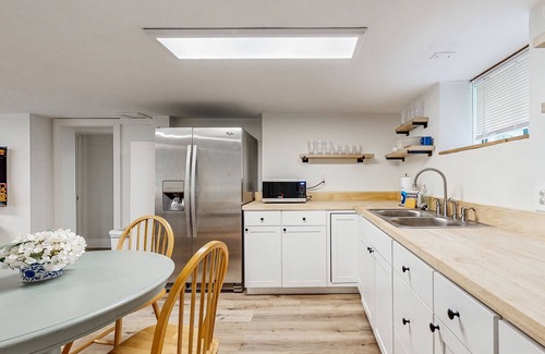 The first floor of this magnificent snowbird-friendly retreat is a separate apartment-like setting, with a separate entrance, and a convenient open floor plan. The kitchen is complete with all the essentials, including a beautiful Keurig coffee maker. There is no dishwasher available there, but the main house does have one. Unwind in the comfy living room and stream your favorite movies and series on the smart TV with cable and streaming options. This retreat also features two well-appointed bedrooms.