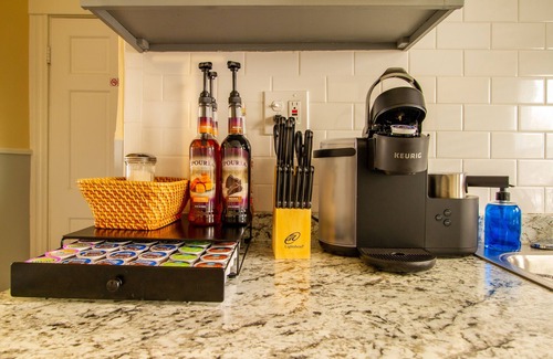Coffee ( regular & decaf), Tea, creamers, sugar, sweeteners and bottled water are always in stock for our guests.