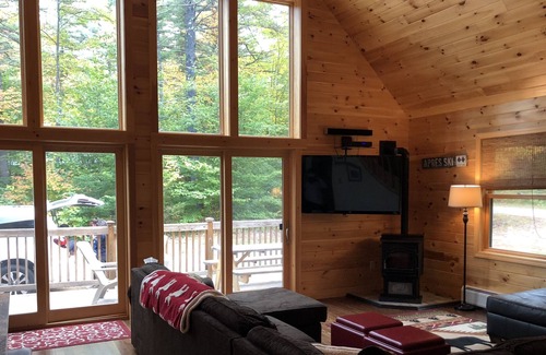 Your perfect vacation retreat awaits! This cozy 4 bedroom, 2.5 bath newer construction, log home, located in a quiet neighborhood between Attitash and Bear Peak (walking distance to Bear Peak) includes over 2,000 square feet and open-design living space. Very well laid out, this home can comfortably accommodate 2 families. Walk in through the spacious mud-room to the main floor, which includes an open-design living room and kitchen area with a pellet stove. The kitchen contains modern appliances (including a Keurig Coffee Maker as well as a traditional one), a center island which seats 4, and a counter height dining table with seats for 6. Look across to the living room area where you can gather around the large comfortable sectional and enjoy beautiful outdoor views from our floor to ceiling windows, or watch your favorite shows on the large flat-screen smart tv. (New tv purchased in 2023!)