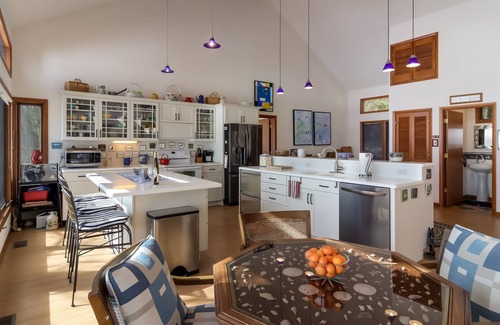 In Tonawathya, the light, bright, fully-equipped kitchen features white shaker-style cabinets, fun light fixtures, two kitchen islands, and huge windows showcasing the lake. There are multiple places to dine, from the eat-in kitchen table and stools at the kitchen island to a formal dining table for six and a cozy breakfast table for two.