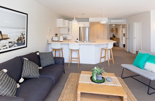 Light sunny and North facing this trendy apartment looks directly at Mauao (Mount Maunganui). Your modern, open-plan living space leads onto an outdoor deck area, there's plenty of access to the sea breeze and summer Sun.