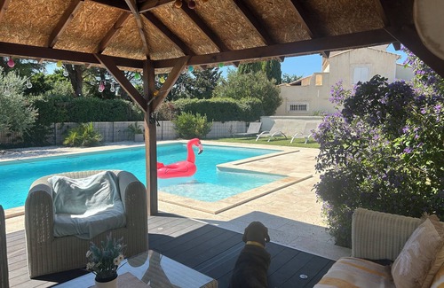 Pleasant house facing south, sunny, calm, large garden area. Swimming pool of 11m by 6m, plot of 3000m fully fenced, house of 150m square, 3 bedrooms, fitted kitchen, full appliance, washing machine, animals accepted, sleeping for 6 people, linen provided, large parking near Avignon for the festival, near Chatauneuf de Pape, near Mont Ventoux, near Orange, Courthezon, Bedarrides
