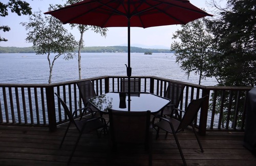 Spacious 3000 sq ft, waterfront, 4 season home and seasonal summer cottage directly on beautiful Lake Winnisquam, New Hampshire. Two or three families can easily enjoy this property that sleeps a maximum of 12 people (10 people in fall, winter, and spring without summer cottage). The main home includes an 8 ft slate pool table, open area living with a large dining area and two fireplaces. The fully equipped kitchen is appointed with granite counter tops and plenty of space. On the main level, an extensive 300 sq. ft. deck with 3 season porch overlooks 125 feet of private waterfront which is enjoyed from a 25 foot dock. A second deck on the third level and a first level patio also view the gorgeous sunrises, Gunstock Mountain, and the lakefront. **Please note: the main home bedrooms are accessed only by a slim spiral staircase. This may not be ideal for people with ambulatory difficulty.** The summer rentals include a cozy, one bedroom cottage with a galley kitchen and a living room. It has its own deck also overlooking the lakefront. It is all driveway level so convenient for those who can’t climb stairs. The property provides lakefront solitude and fun with a canoe ready for your use. Just minutes from local attractions. The crystal clear water of Lake Winnisquam makes for unforgettable summer days; the foliage against the lake is a must see in the fall; and the access to such an array of winter/snow sports makes it a property for any time of the year.