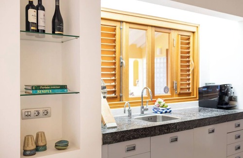 Through the large sliding doors you enter the porch with a covered seating area and another dining table. It’s easy to celebrate your vacation next to or in the infinity pool. You will find a fine lounge set and luxurious sun beds.