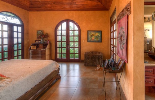 This secluded villa on a hilltop overlooking the Pacific is surrounded by thousands of acres of virgin forest and is perfect for three couples or a large family. The main house has two master suites w/ large bathrooms, one up & one down. & a twin bed in the TV room with full bath.. The living area opens to a “Lake Como” style veranda that looks down on a beautiful cove and also has spectacular mountain views….as does the open air covered dining area. The large pool is set between the casita and the main house. The casita has the identical views and is complete with kitchenette & sitting area & full bath. If you are looking for a real getaway that is totally private with fantastic views, you will not find anything better. There is a private entry (not public) at the entrance to the project and a 4 kilometer scenic drive to the house. We are located half way between Nosara & Samara and only 3 kilometers from the small fishing village of Garza. The private beach inside the project is just a 1 kilometer walk down the hill from our house on the main road or you can drive down & park near the beach. If you like horse back riding, surfing, canopy rides, or playing bridge it’s just a 25 minute drive to Nosara. We have a beautiful new tennis court in the subdivision where children & adults can take lessons. There are several small quaint restaurants in Garza, but numerous in the near by towns of Nosara and Samara. Get away from the tourist scene and have a secluded and romantic setting only minutes from restaurants and fun activities. Our pricing includes both the main house and the casita. We have a project manager/gardener during the week and upon request will stay at night when you are going out for dinner. The maid comes twice weekly. Be sure and read the reviews. Sept & Oct are the heavy rainy months.. Your inquiries come to our cell phone so we should be able to return your call within hours.