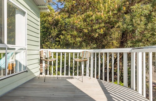 Living area with timber floors, TV, DVD, Wi-Fi with Chrome Cast and stereo adjoins small deck, kitchen with microwave and dishwasher opens onto covered deck with gas BBQ and outdoor setting.