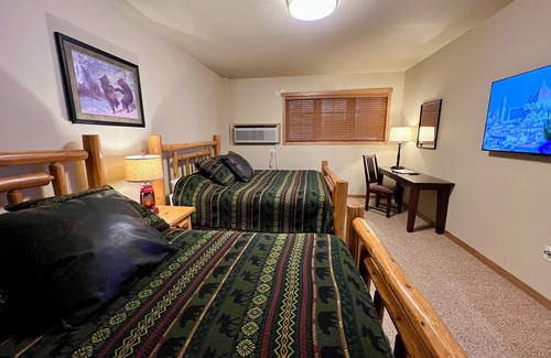 1 King and 1 Queen bed The family friendly arrangement of our Studio guestrooms makes your family vacation a breeze. Store snacks in the mini-fridge and microwave some popcorn before movie time on the satellite TV. A spacious bathroom helps everyone get ready and out the door on-time for whatever adventure has been planned for the day.