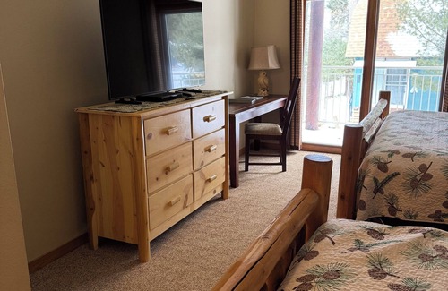 Year round hotel-style 442 square foot room unit with private bath that has a tub with shower, and a balcony. 1 King and 1 Queen The family friendly arrangement of our Studio guestrooms makes your family vacation a breeze. Store snacks in the mini-fridge and microwave some popcorn before movie time on the satellite TV. A spacious bathroom helps everyone get ready and out the door on-time for whatever adventure has been planned for the day.