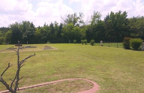 Quiet neighborhood just 5 minutes from the OKC Zoo, Softball Stadium, Science Museum, Remington Park, and The 45th Infantry Division Museum. Beautiful greenbelt, with over an acre of land for family fun. Completely fenced in with safety entry gate. Fully stocked gourmet kitchen, and full-size washer and dryer.