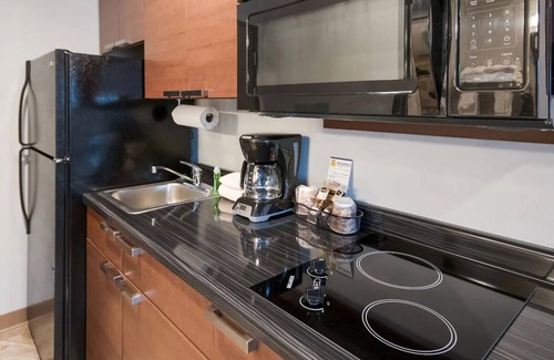 - Kitchen with coffee maker, microwave, cooktop, and refrigerator;