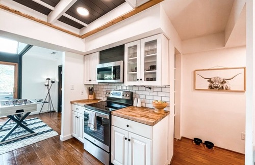 The main living space offers a romantic wood burning stove furnace and floor to ceiling windows that frame the picturesque mountain views. Curl up on the couch and put on your favorite movie (complimentary Netflix available on the Smart TV). Up for some competition? Strike up a match at the Foosball table and put your skills to the test! Don’t forget to snap some memorable photos in front of our “Stay Wild” Feature wall and tag us @StayWild_NC for an opportunity to be featured on our Insta page!