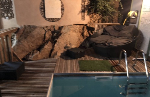 Terrace equipped with a wood oven for pizza and barbecue a covered dining area, lounge area with extra pool and inflatable spa