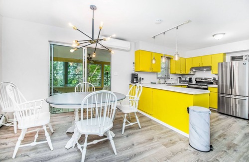 The main-level living space is wonderful for mingling, bringing together a sunny living room with a fireplace, a six-person dining room table, and a full kitchen with cheerful yellow cabinetry and stainless steel appliances (including a French-door refrigerator and a dishwasher). There's a Weber gas grill outside to assist with afternoon barbecues, a screened-in porch off the dining room where you can relax both morning and evening, and a second living area downstairs that's great for kids. At night, you can gather around the firepit for s'mores in the yard, watch the stars come out from the warmth of the private hot tub, and eventually retire to one of the comfortable sleeping spaces. There are three bedrooms upstairs on the third level, while the basement-level living room doubles as a fun-filled bunk room for the kids.