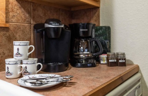 The kitchen is fully stocked with everything you need for a full meal or just a snack. There are plenty of plates and utensils, a crock-pot, cookie sheets, and muffin pans. Spend time visiting with family and eati in instead of rushing around and waiting in lines. Right off of the kitchen is a large screened-in porch overlooking beautiful trees. It's a wonderful place to sit and catch the breeze, or enjoy your morning coffee.