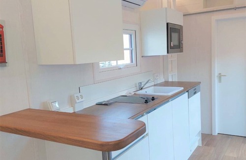 The Tiny House will surprise you in great surroundings. A vacation destination for you and your loved ones. The "Tiny House Paradise" is located in (Priort) Wustermark and is a great destination to relax, unwind or experience something new. The two-storey accommodation consists of a living/sleeping floor. The double bed, loft-style, is accessible via a cupboard staircase. With a fully equipped kitchen and bathroom, it sleeps 3-4 people. On-site amenities include high-speed WiFi suitable for video calls, a workstation for home office, air conditioning, a dishwasher and a fan for comfortable air in the bathroom and against humidity. There is also a fully automatic coffee machine, kettle, toaster and a bio-fuel fireplace, which can be used for a fee. The fridge has a freezer compartment and the microwave has many functions.