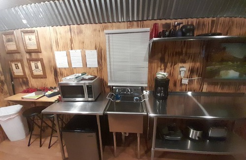 Outside area has a park style firepit/grill that can be used with charcoal or wood. Firewood can be purchased on site.Picnic table or sit in the swinging bench seat by the fire. 2 hammocks to look up at the amazing star view at night. Very nice area with plenty of privacy for you. This is a one of a kind listing and we would love to have you and your family or pet in our cabin.