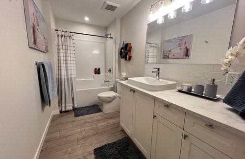 Step into a modern oasis with spacious, light-filled rooms and stylish décor. The open-concept living area features comfortable seating, a large flat-screen TV, and seamless access to the fully equipped kitchen. Whether you're preparing a gourmet meal or enjoying a quick snack, the kitchen has everything you need, including high-end appliances and ample counter space.