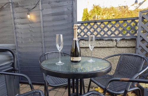 An enclosed patio area with private hot tub and garden furniture for alfresco dining.