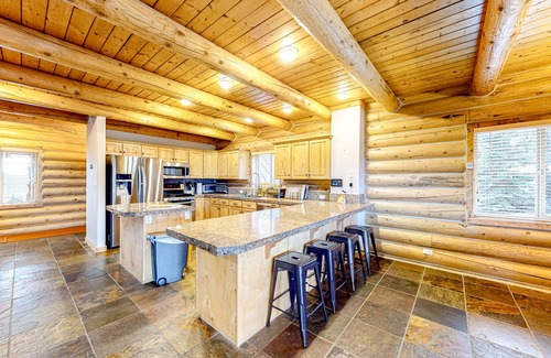 When all you want to do is relax, head inside to the cozy, wood-lined interior. Warm up next to the stone fireplace, relax on the comfortable sofa, and tune into your favorite TV shows and movies. The adjacent kitchen gleams with granite countertops, a center island, and stainless steel appliances. Steps from here, you'll find a large dining table and a separate laundry room.